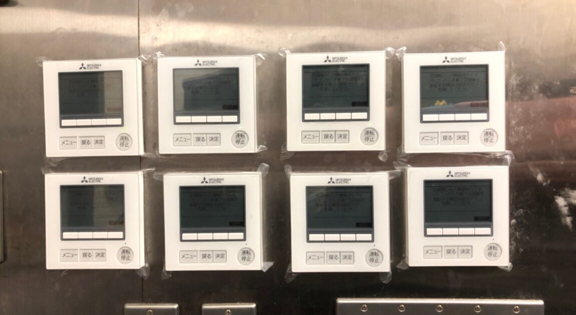 トータルメンテナンス契約を頂いているベーカリーチェーン様の空調機のリモコンが全台効かなくなり緊急で交換工事を行い無事に完了いたしました。 ベーカリー店舗の厨房内はドライキッチンであることや小麦粉の飛散も相当量あり空調機のダメージは測り知れないレベルになっております。定期的な洗浄や部品交換を実施させて頂いております。