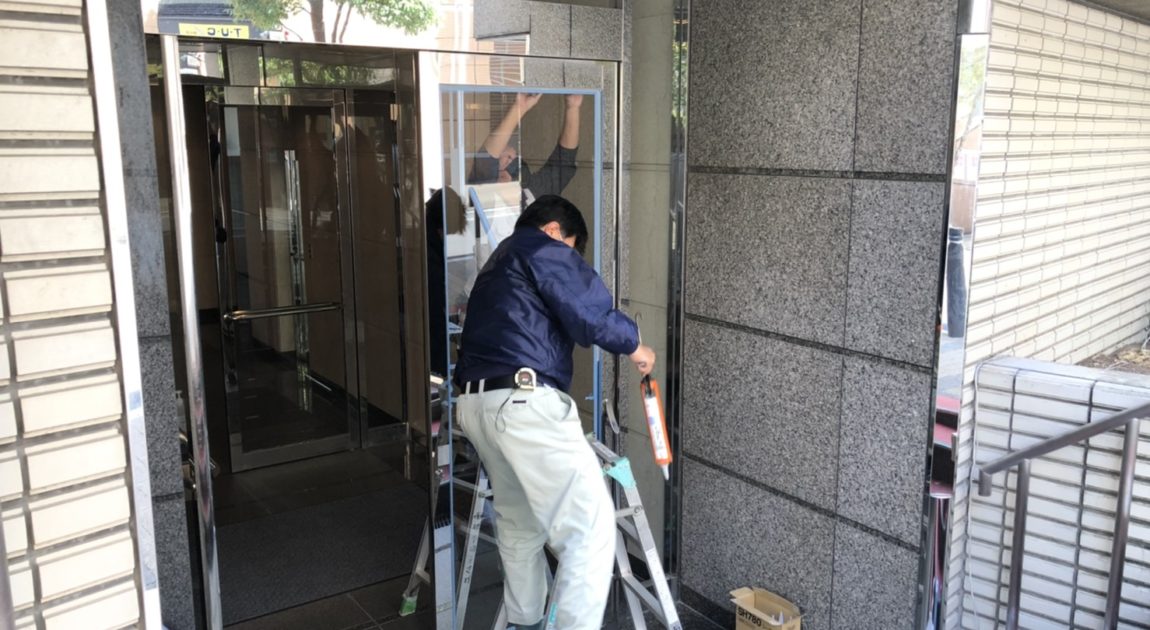 都内のオフィスビルのエントランスの扉のガラスが破損し入居者の皆様に危険があるため緊急の依頼をお受けいたしました。まずは初期対応で破損ガラスの処分と養生処理実施し、その後新ガラス交換のお見積を提出し決済いただき本日ガラスの交換工事を実施いたしました。