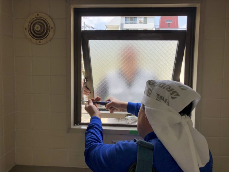 2Fの女子トイレであった事と建物外壁が老朽化しているため隣の敷地から足場を立てて3日間の工程で交換を完了しました。